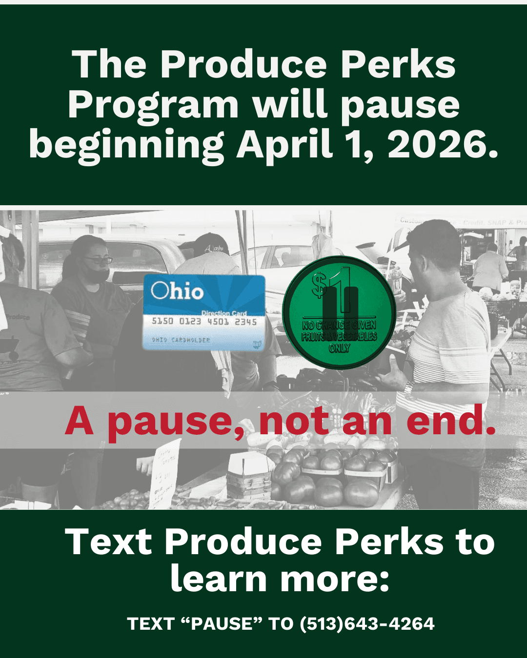 Please know that our other nutrition incentive programs, including the Family Fruit and Vegetable Program and the Produce Prescription Program, remain operational and will continue to serve communities throughout Ohio.