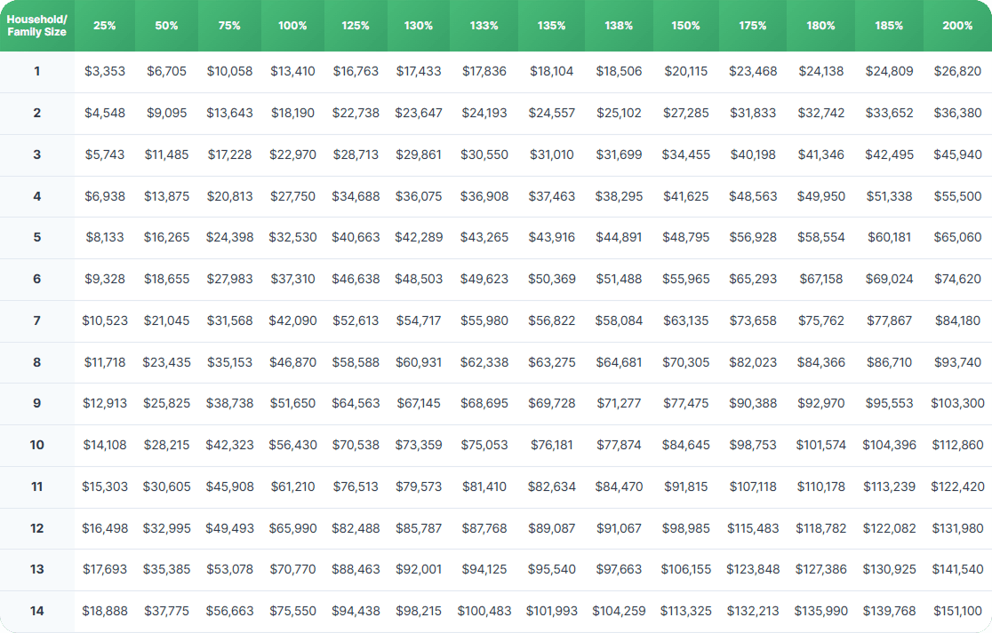 Households with gross monthly income at or under 130% of the federal poverty guidelines. Some households may qualify if they have incomes over the limit if someone in the household is elderly or disabled. This chart shows gross annual income as a percentage of the federal poverty level.